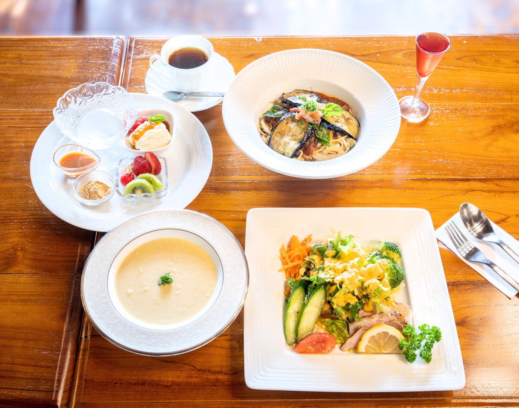 コースメニューは、「薬膳カリー」と「パスタ(ボロネーゼ/和風)」の2種類からメインをお選びいただけます。メインのほか、自家製ハムを使った季節のサラダや日替わりポタージュ、自家製酵素ジュースも添えた充実の内容です。